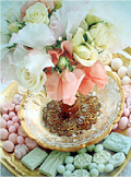カラーウェデイングがかなり評判になった頃、堀江さんのバンケットでホテル学会のご夫婦が集まるフォーマルパー ティを開催することになりました。そのパーティ前日は夜中の2時まで堀江さん初め、スタッフの人たちと完璧にデコレーションし、クロスにアイロンをかけたり、演出を考えたり、時間の立つのも忘れるほど夢中でした。地下のバンケットホールでしたがイメージはまるでガーデンパーティのようになるようにデザインしました。10人がけの円テーブルの上に160cmぐらいの木を真ん中にそれぞれ置き、それに季節の花や蝶、鳥を沢山つけたのも。こんな無理なことを「面白い!!面白い!!先生是非好きなようにしてください」といって下さったのです。